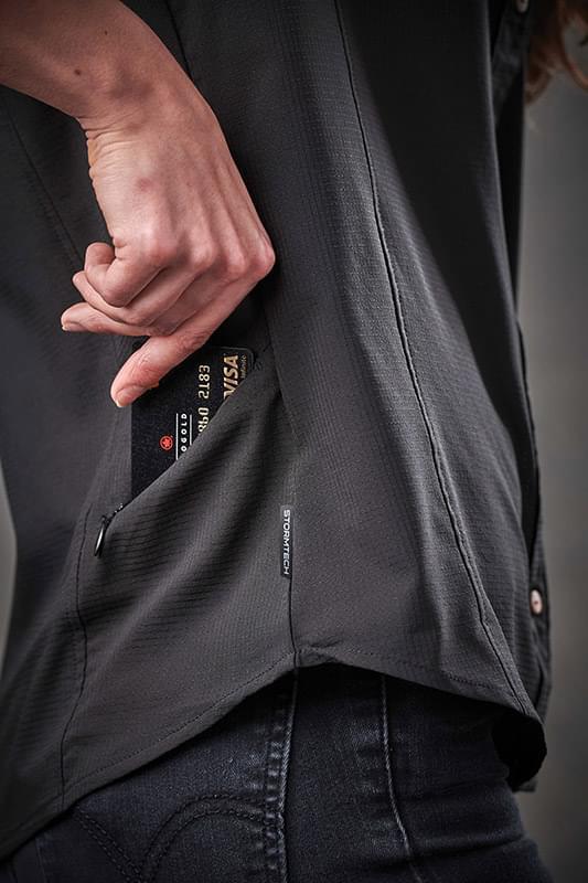 STORMTECH H2X-DRY® Moisture Management Air Flow Technology Full Front Button Closure Single Chest Pocket Contoured Hem Flat Felled Side Seams 100% Polyester, 2.86oz/yd2 (USA)/ 97gsm (CDN) Colours Black, Heather Grey