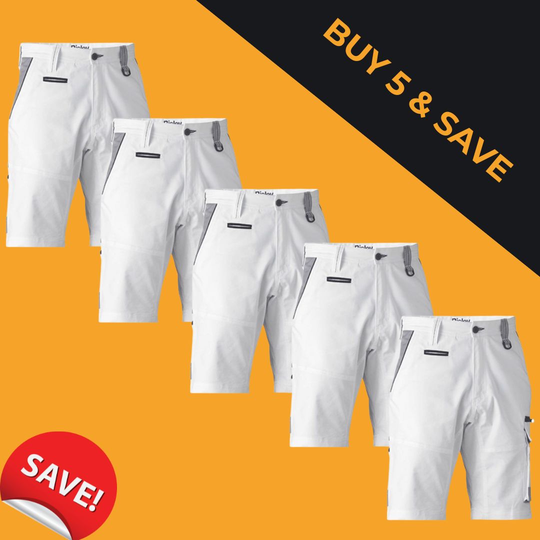 5 x Bisley Painters Contrast Cargo Shorts – White – $80 Each (RRP $89.95)
